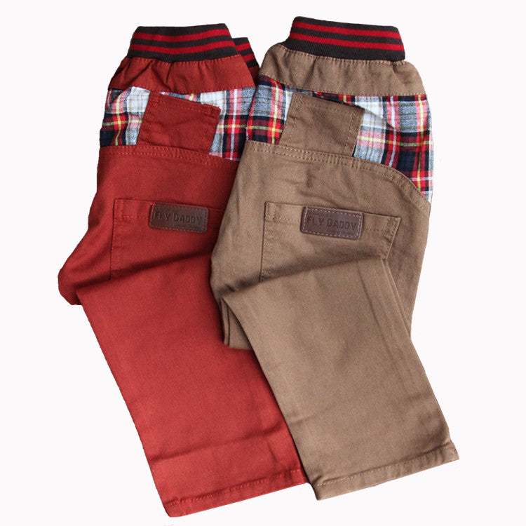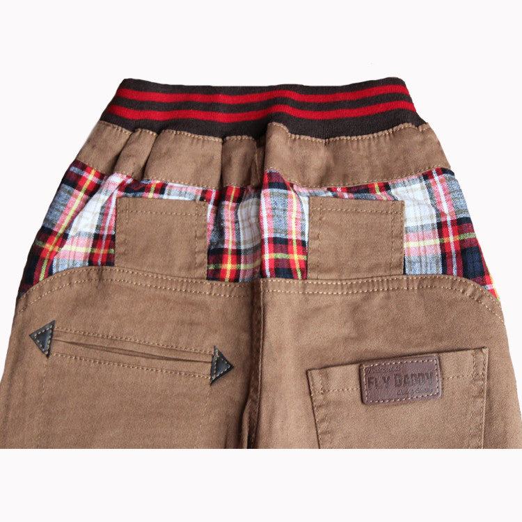 Features checked patterned contrast on both side pockets and back.