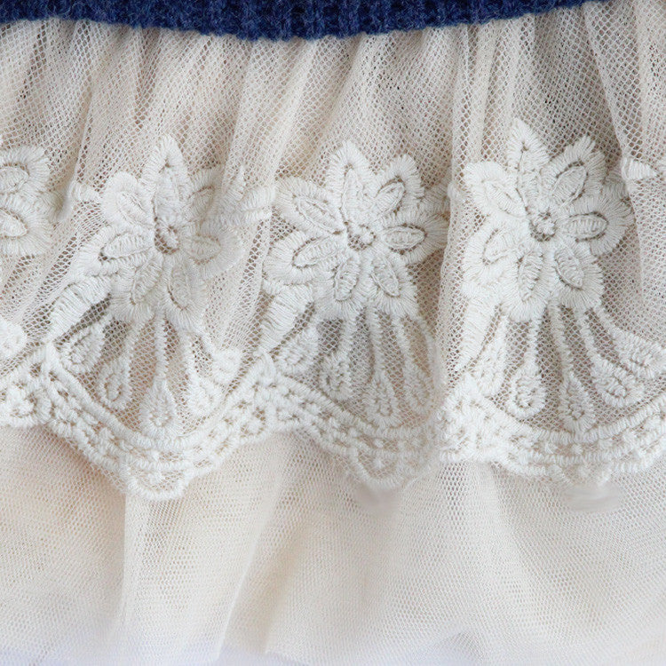 This is a unique jumper dress with a tulle skirt attached with a detailed lace overlay.